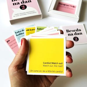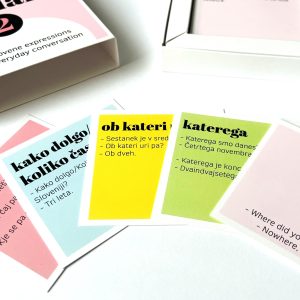 Na sprednji strani kartice se nahaja osnovna beseda ali fraza z nekaj tipičnimi primeri v slovenščini, na hrbtni strani pa je angleški prevod.